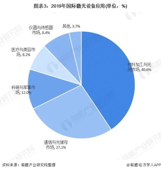 國際激光設備應用較為多元化,包括材料加工與光刻市場、通信與光儲存市場、科研與軍事市場、醫療與美容市場、儀器與傳感器市場等,其中,材料加工與光刻市場占比最高,達40.6%;其次為通信與光儲存市場,占比為27.1%。