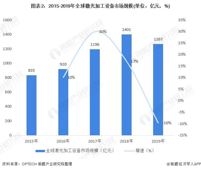 全球激光加工設備市場規模超過千億元,2019年達到1267億元,同比下降10%。